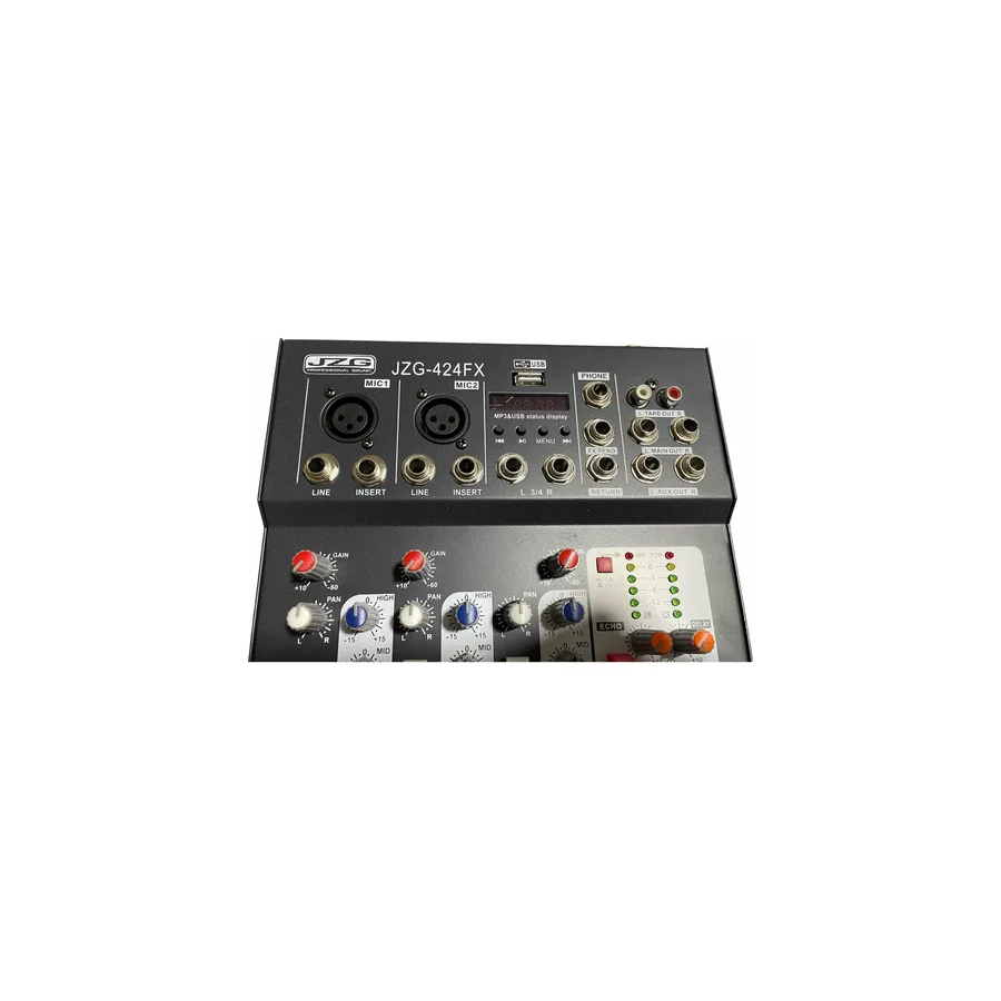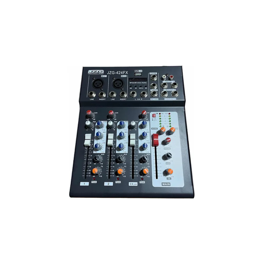 Marca JZG Modelo Jzg-424FX Voltaje 110 Otros Tipo de consola Analógica Tipos de alimentación Corriente eléctrica Con alimentación fantasma Sí Con efectos Sí Principales efectos incluidos Delay eco Conectores Xlr plug Cantidad de canales 4 Conectividad 0