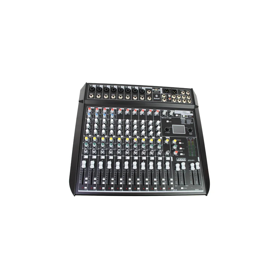 Mezcladora de audio JZG14FX 14 entradas de micrófono, 8 mono+ 3 estéreo Ecualizador de 3 bandas Lámpara de señal PAN, MUTE, THD Fader logarítmico de 60 mm Salida de grupo de SUB 1/2 Supervisión doble de 12 niveles fuente de alimentación fantasma de 48V Monitoreo independiente+ Monitoreo de auriculares para salida L/R en el canal principal, grupo SUB, SOLO y botones de distribución de señal de bus 2 entradas de retorno auxiliar estéreo, PC USB-A 2.0 interfaz, reproducción USB Envío auxiliar + envío FX, entrada REC y salida de grabación 99 tipos incorporados de 24BIT DSP+ Pantalla digital Fuente de alimentación integrada de 100 V/240 V, 50-60 Hz