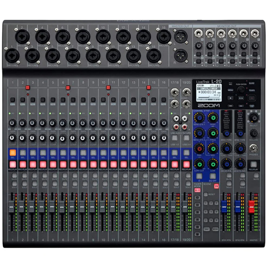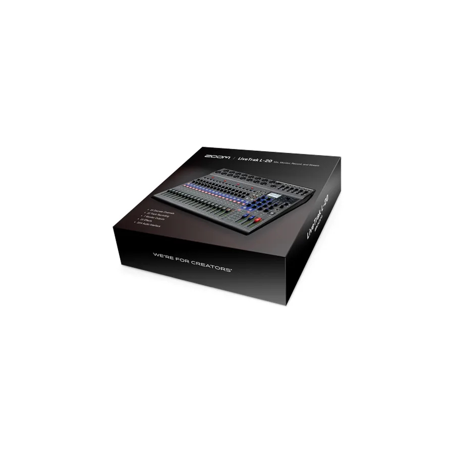 La LiveTrak™ L-20 es la nueva consola digital que ofrece todo lo que los compositores necesitan para mezclar, monitorizar y grabar complejas producciones. Con 20 canales de audio independientes y seis monitorajes de mezcla individuales y personalizados, ha sido construido para arreglos más grandes y más audaces.