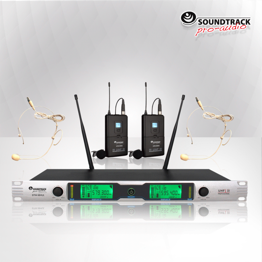 Sistema de micrófono inalámbrico UHF. Frecuencias fijas. Receptor de 2 canales 2 transmisores body pack 2 mics de solapa y 2 mics de diadema. Montable en rack. Pantalla iluminada.